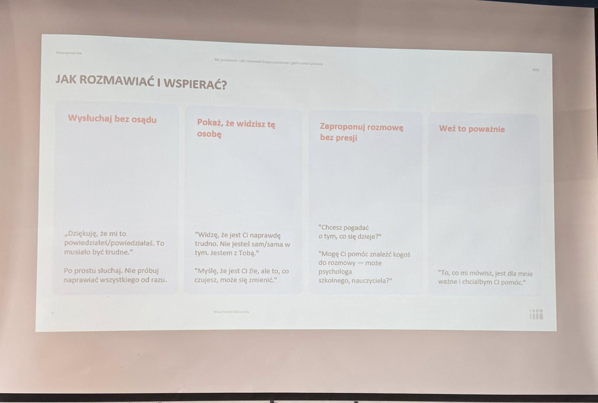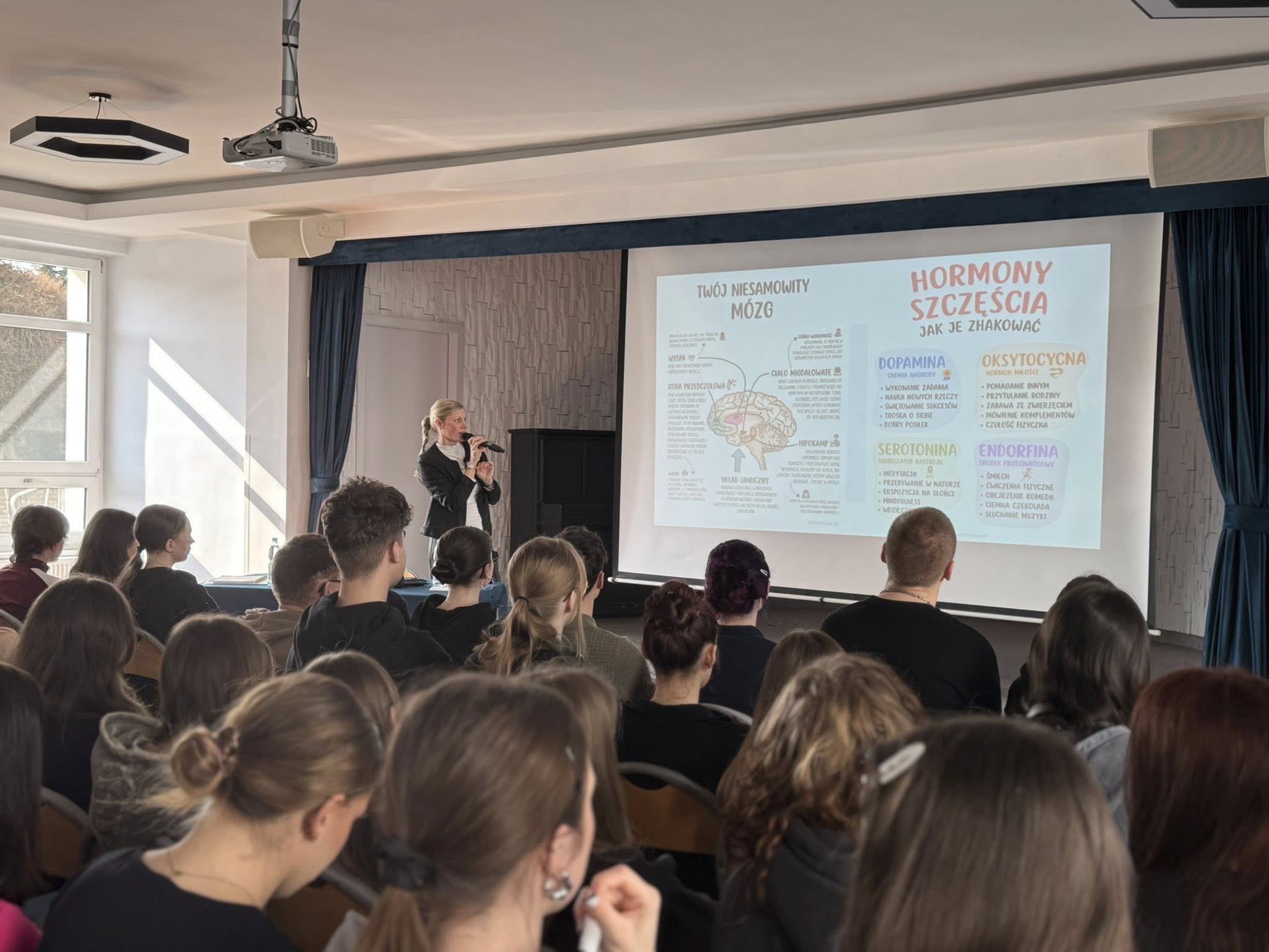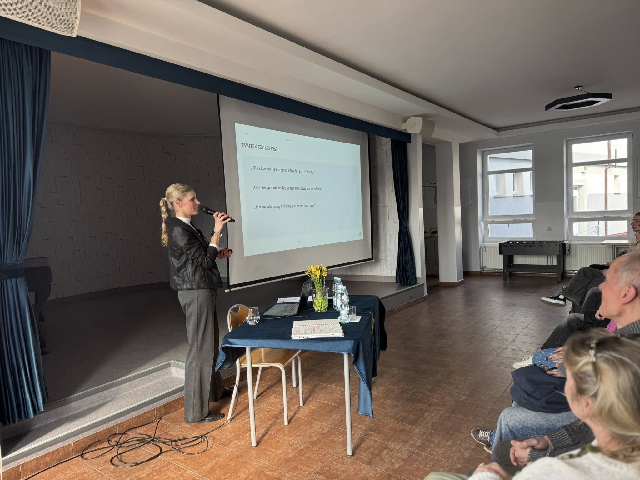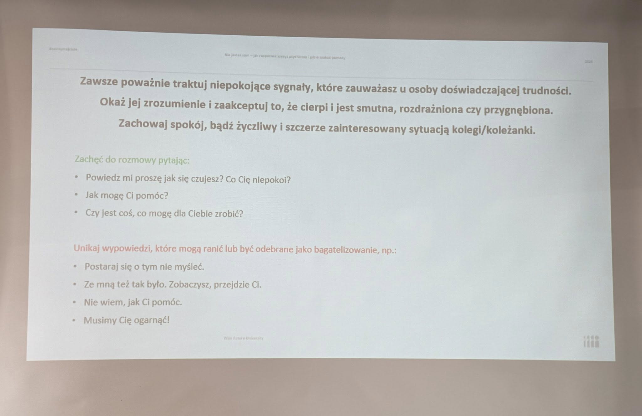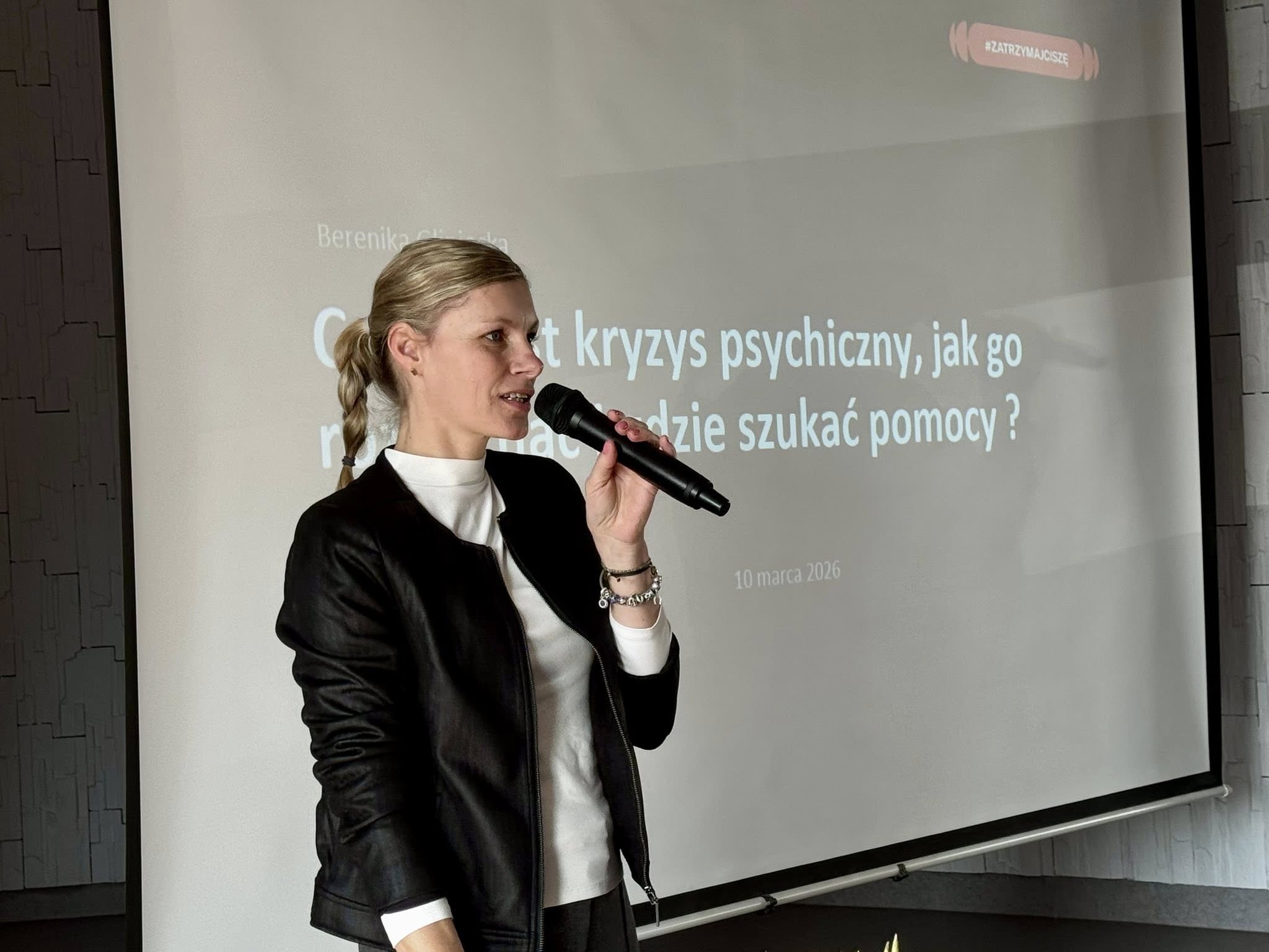 Prelegentka opowiadała o tym, czym jest depresja, jak rozpoznawać jej objawy, gdzie szukać wsparcia oraz jak reagować, gdy ktoś z naszego otoczenia przeżywa trudny czas.