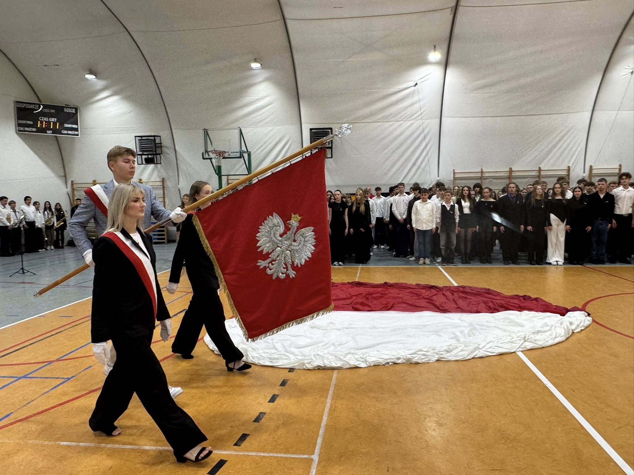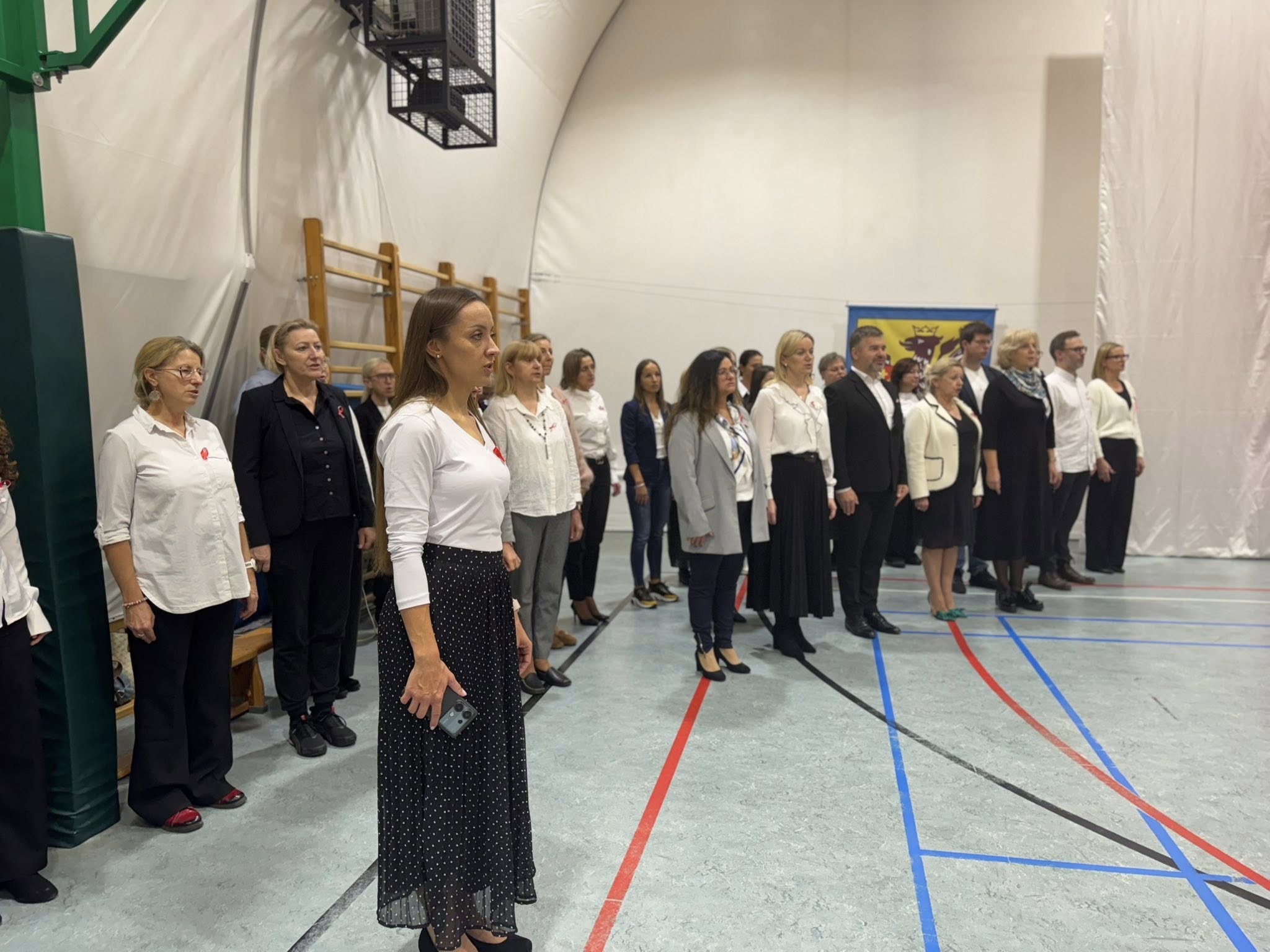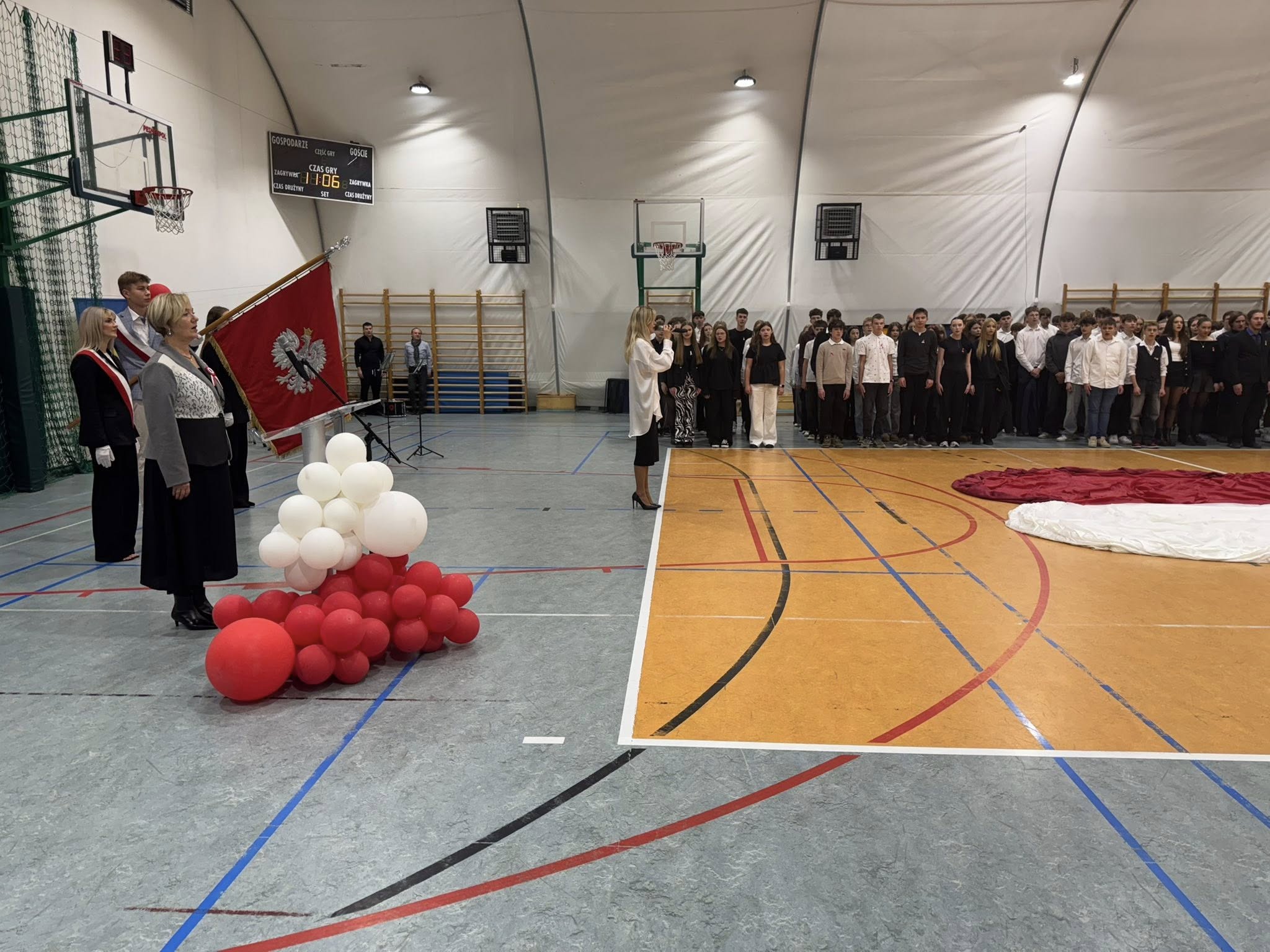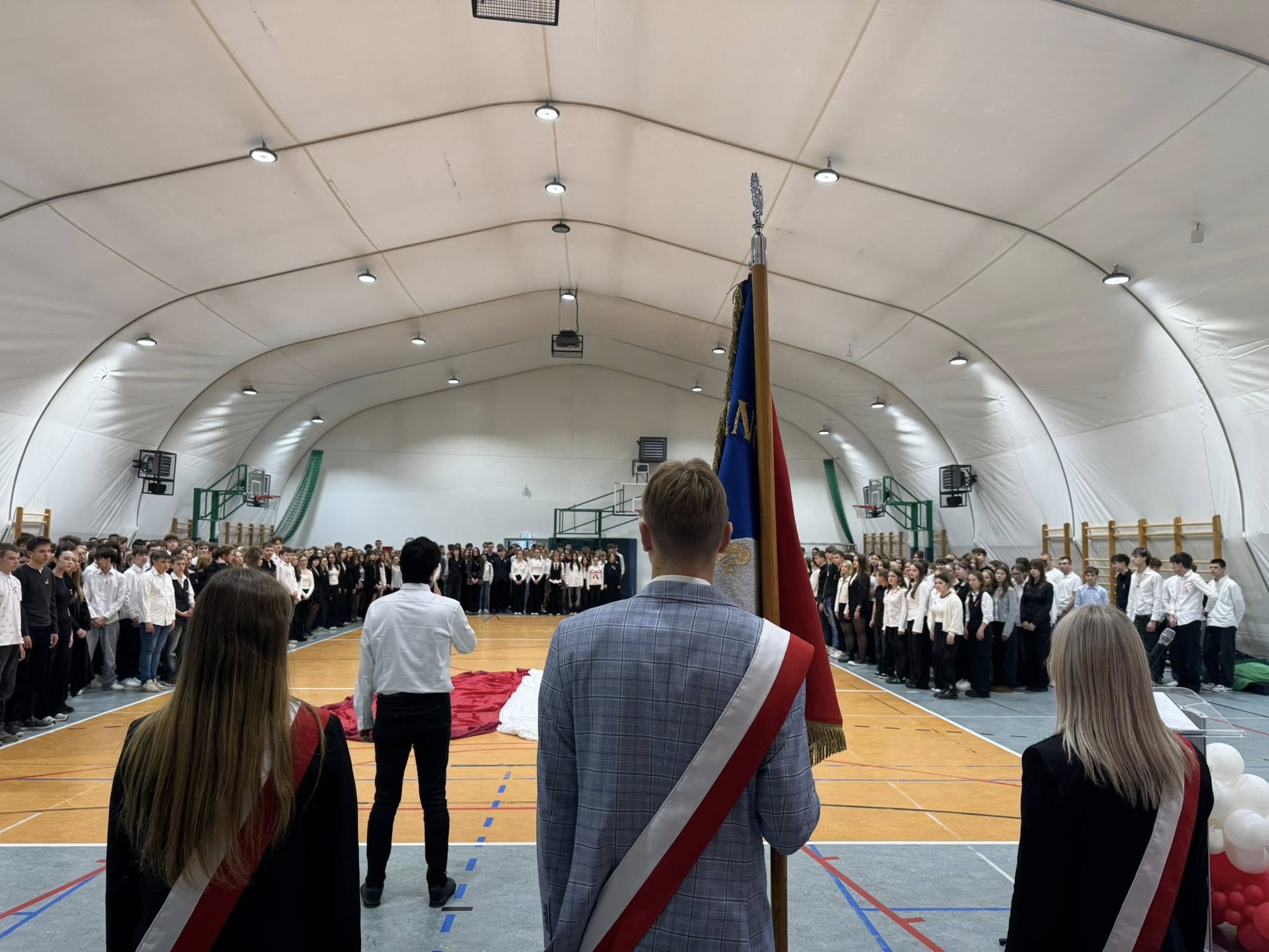 Kulminacyjnym punktem dnia było wspólne odśpiewanie hymnu przez wszystkich członków społeczności szkolnej. Nawet muzyka ze szkolnego radiowęzła była dostosowana do okoliczności.