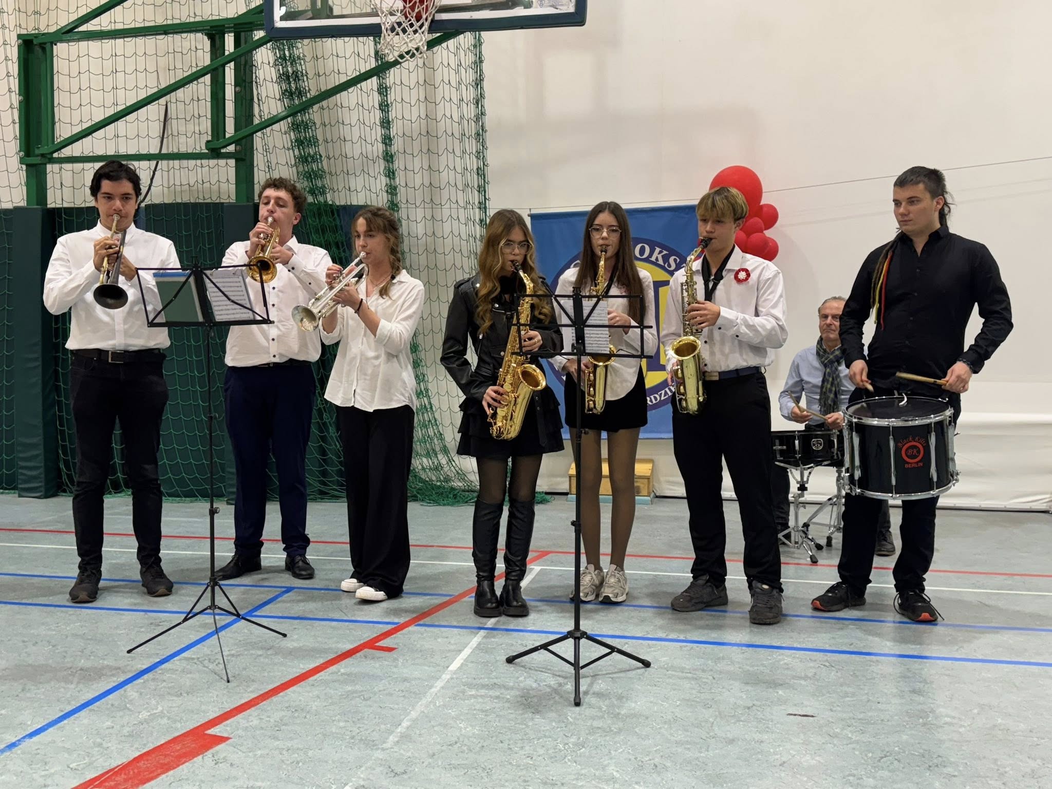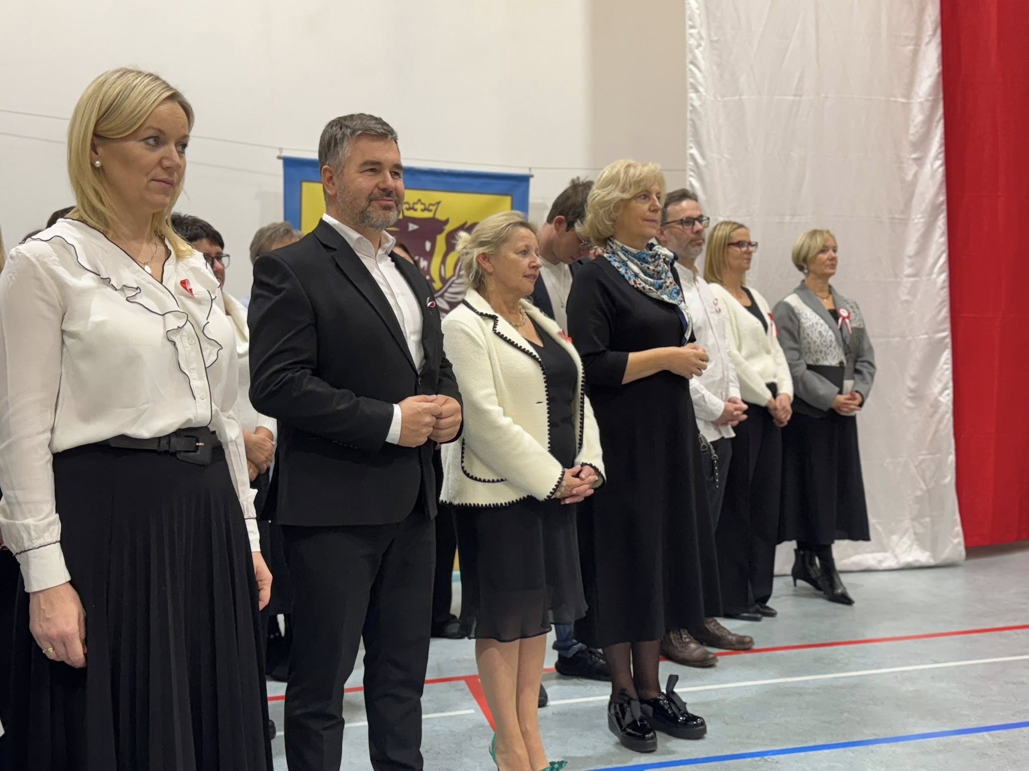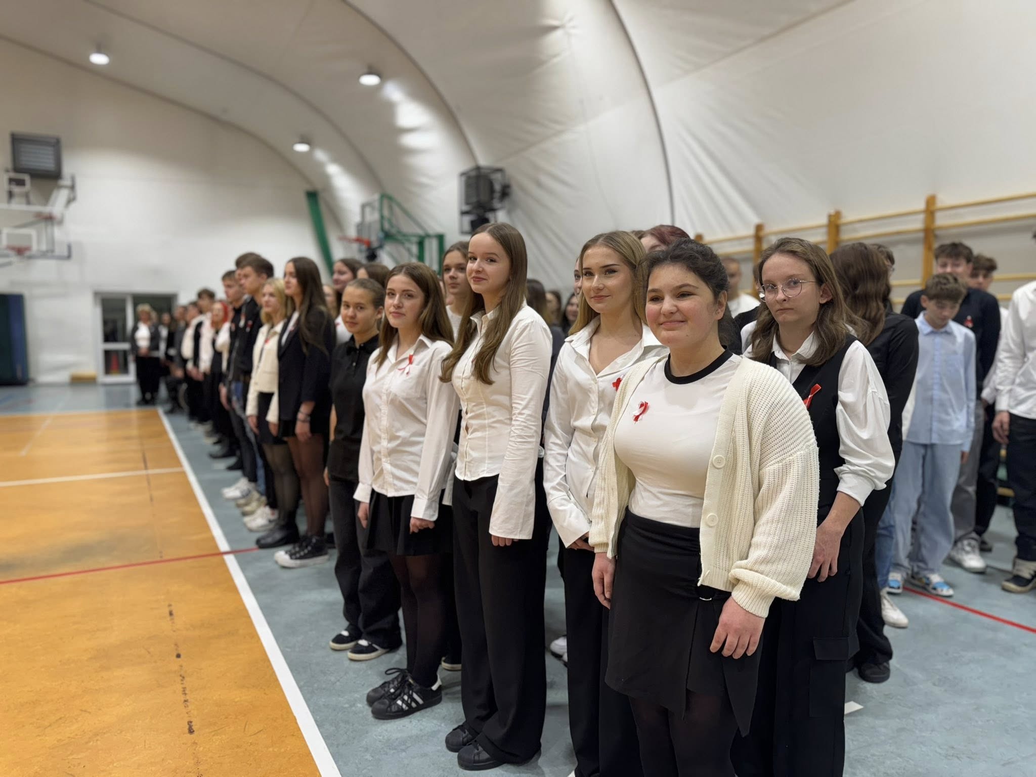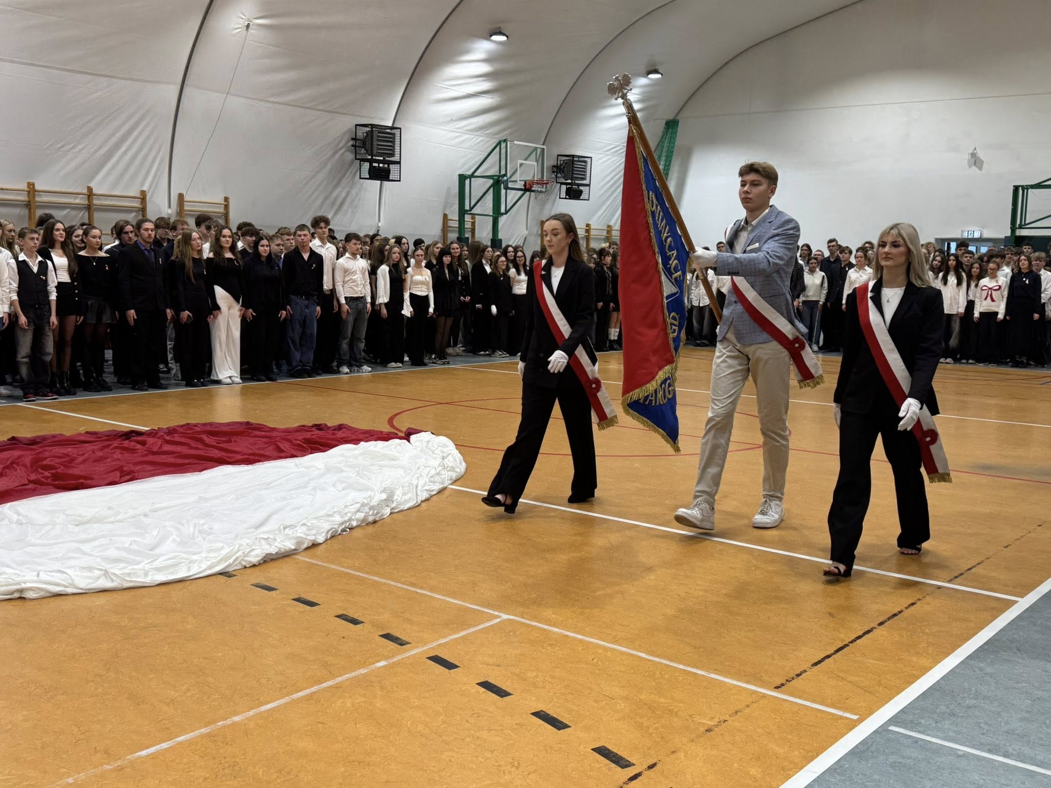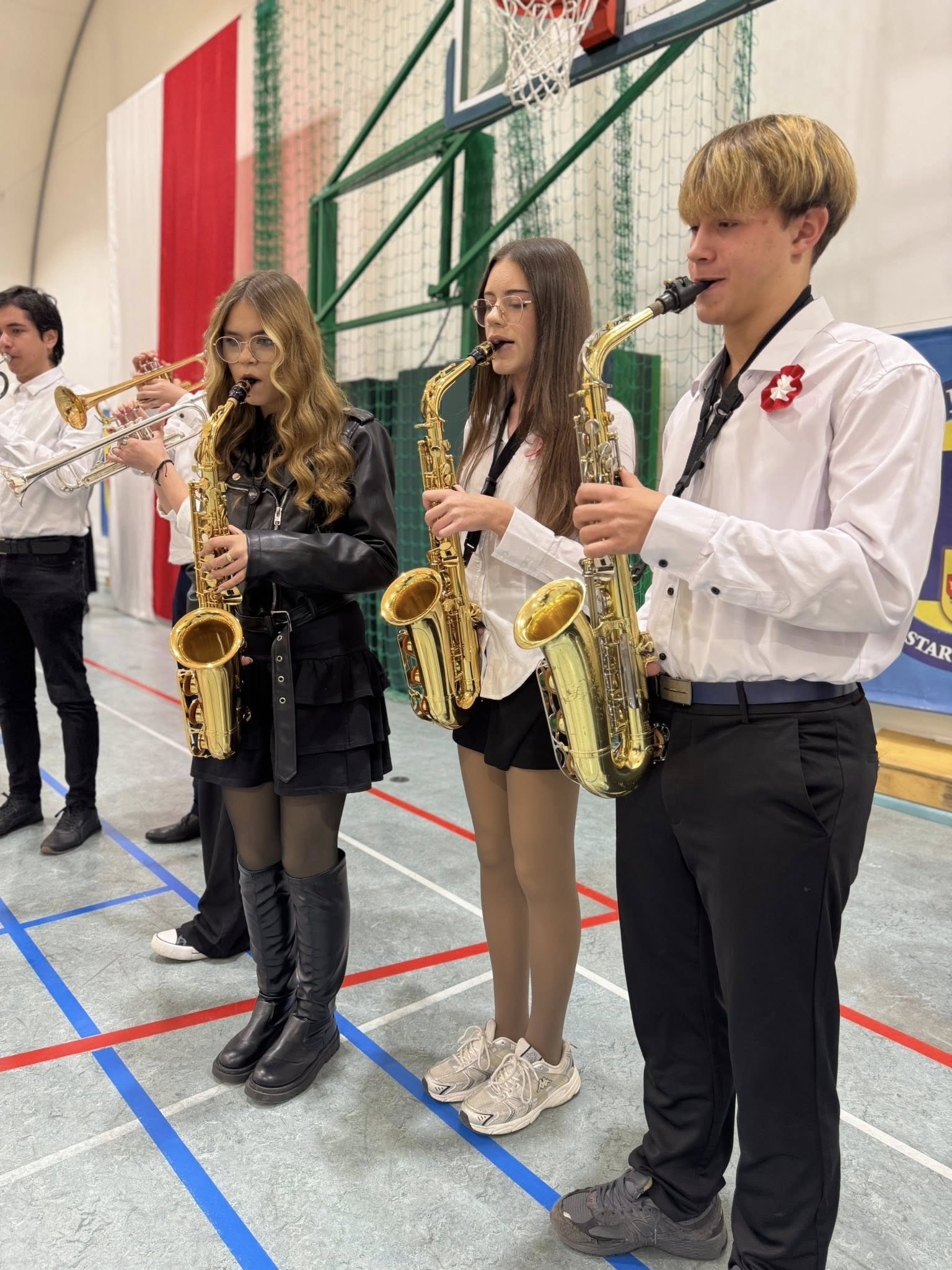 Kulminacyjnym punktem dnia było wspólne odśpiewanie hymnu przez wszystkich członków społeczności szkolnej. Nawet muzyka ze szkolnego radiowęzła była dostosowana do okoliczności.